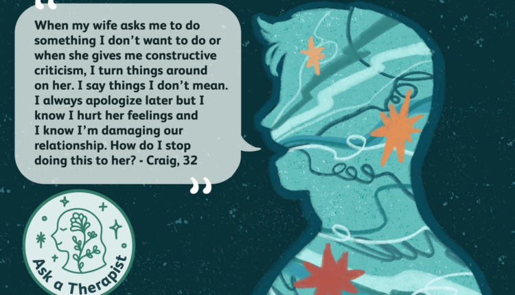 When my wife asks me to do something I don’t want to do or when she gives me constructive criticism, I turn things around on her. I say things I don’t mean. I always apologize later but I know I hurt her feelings and I know I’m damaging our relationship. How do I stop doing this to her?